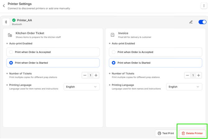 The test print option will generate a sample receipt to confirm that the printer is connected and operational.