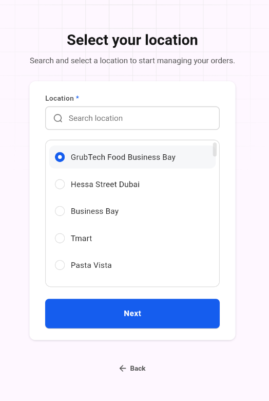 Next step is to activate your account by signing in with your credentials and selecting your designated location. This ensures grubOne is connected to the correct outlet or kitchen.