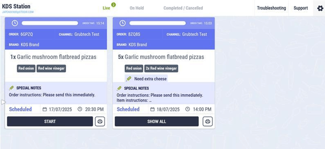 - Purple: Scheduled orders will be visible on the KDS screen in purple color.