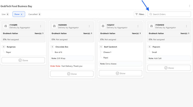 grubOne provides powerful search and filtering capabilities that enable kitchen and retail staff to quickly locate and manage orders.